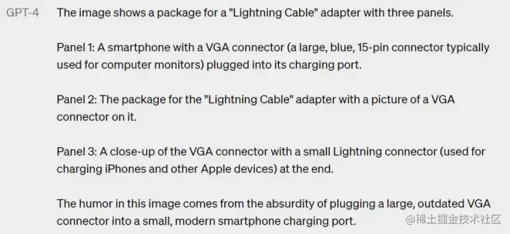 比如给 GPT-4 一张手机充电器的照片拼图,问图片哪里好笑。