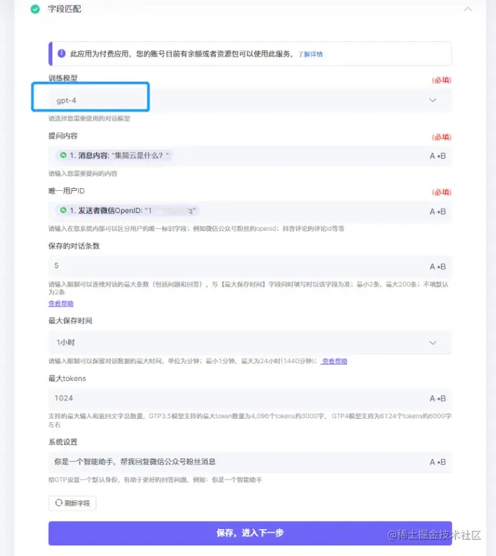 4 在字段匹配中,训练模型选择“GPT-4”,将上一步公众号样本的“消息内容”作为提问内容变量,并添加提示信息,配置到“提问内容”字段中,将公众号样本的用户OpenID配置到“唯一用户ID”字段中,保存进入下一步。
