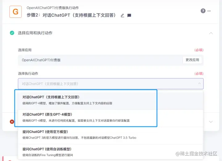 3 将“OpenAI(ChatGPT)付费版“添加为执行应用,执行动作选择“对话ChatGPT(支持根据上下文回答)”或“对话ChatGPT (原生GPT-4模型)”。