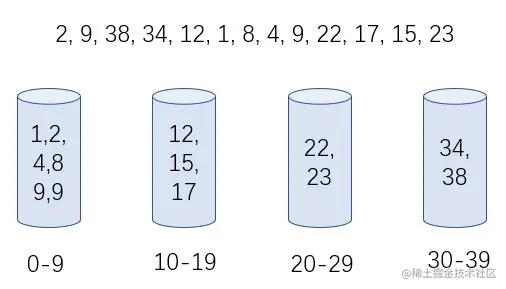 桶排序(Bucket Sort):假设输入数据服从均匀分布,将数据分到有限数量的桶里,每个桶再分别排序(有可能再使用别的排序算法或是以递归方式继续使用桶排序进行排序)