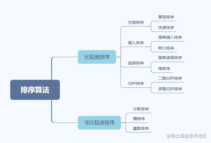 - 比较类排序:通过比较来决定元素间的相对次序,由于其时间复杂度不能突破 O(nlogn),因此也称为非线性时间比较类排序。
