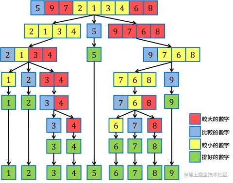 快速排序(Quick Sort):数组选取基准(pivot),小的放左侧,大的放右侧,递归的再对两侧做快排,直到整个数组有序。