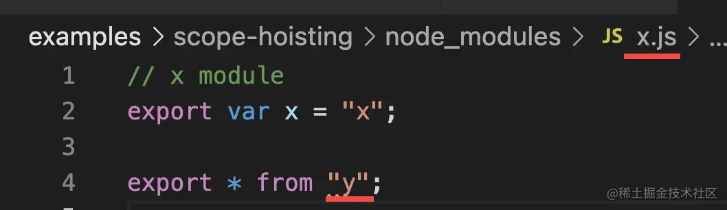 而这个 x 模块里把 x、y 给 hosting 成一个模块了: