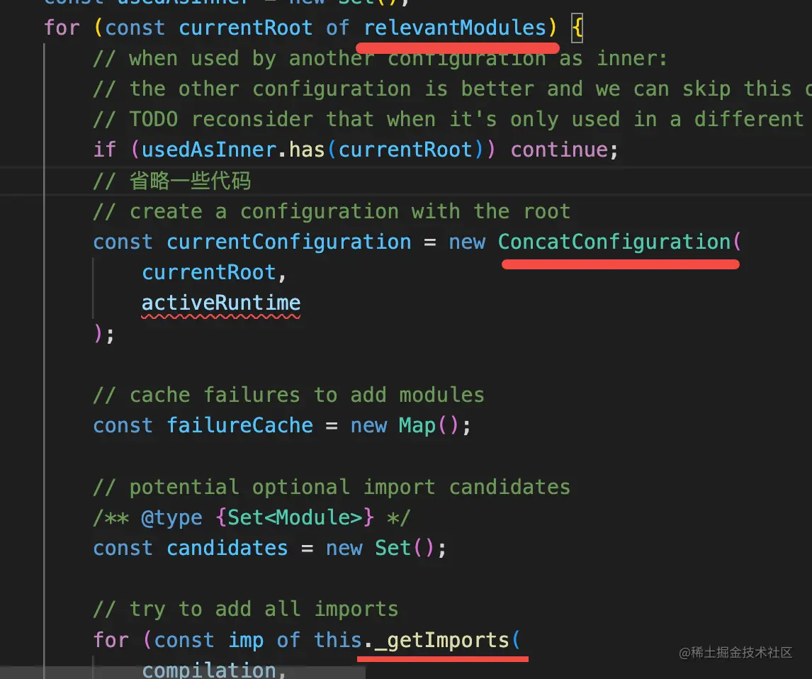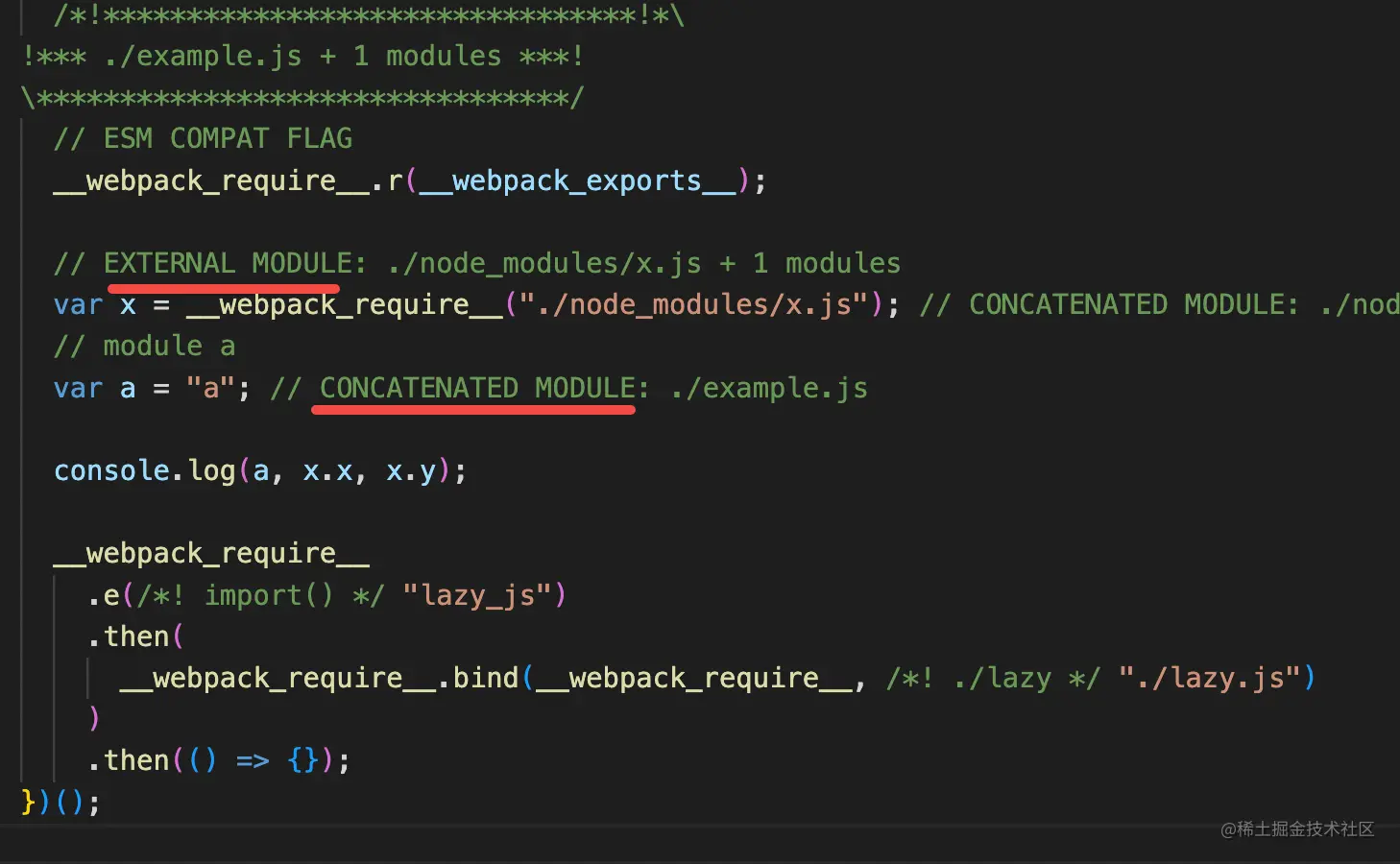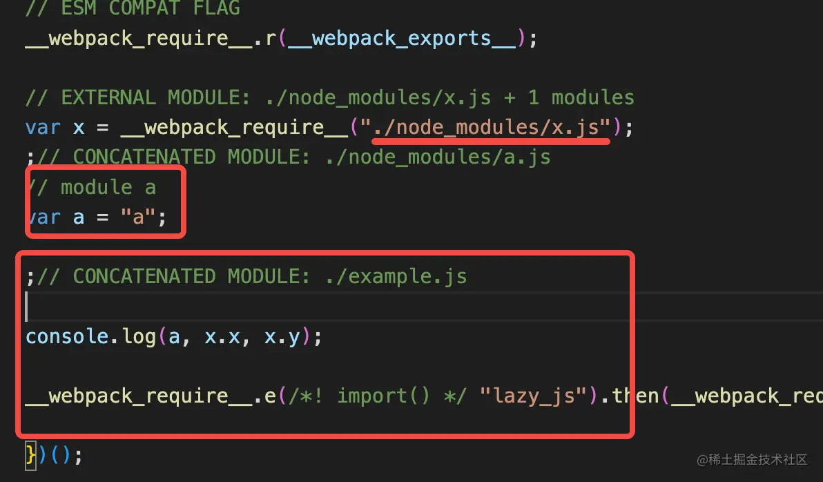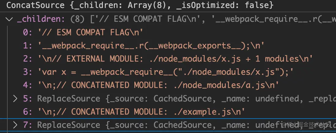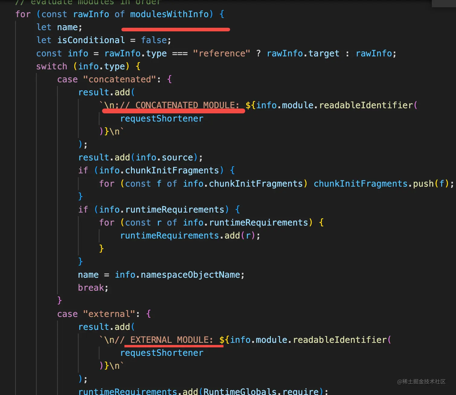 这样当代码生成阶段,就会调用 ConcatenatedModule 的 codeGeneration 方法,这里做了模块类型的区分,同名变量的重命名,以及最终模块代码的拼接。