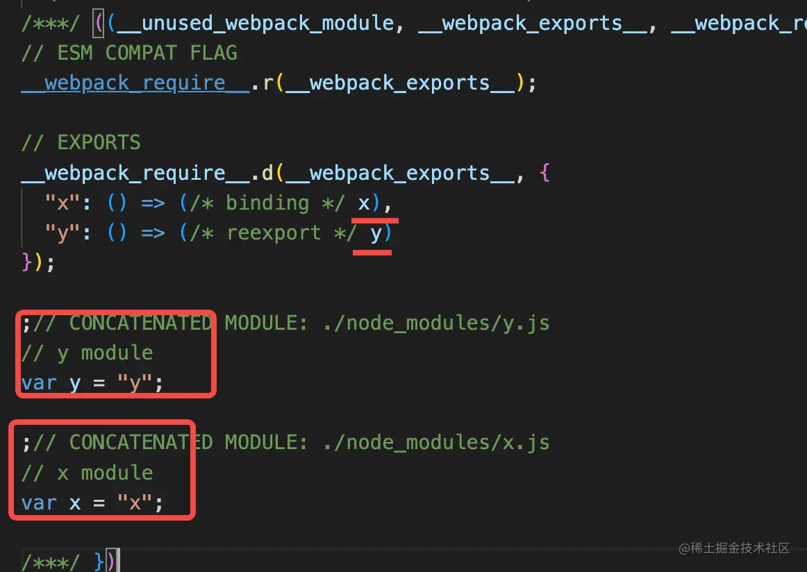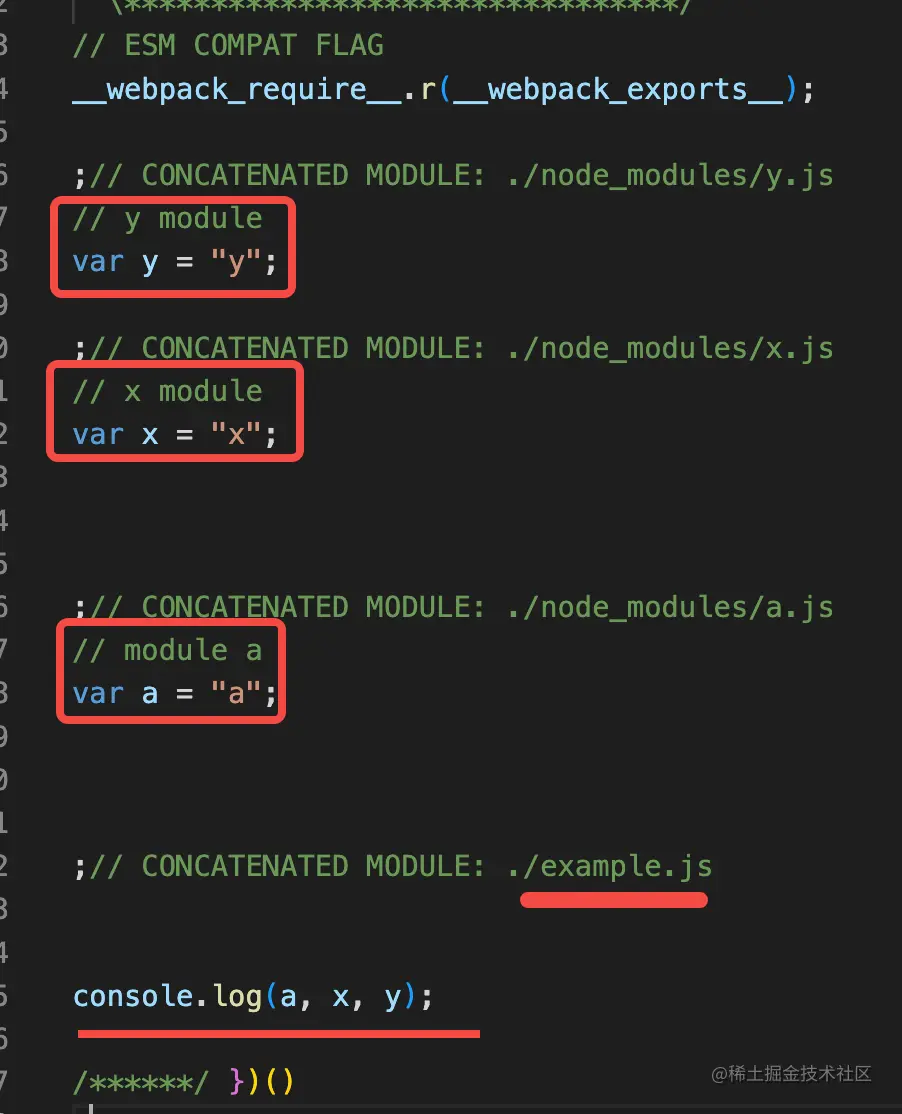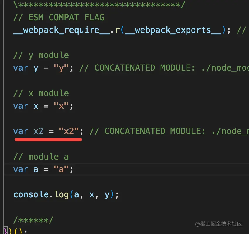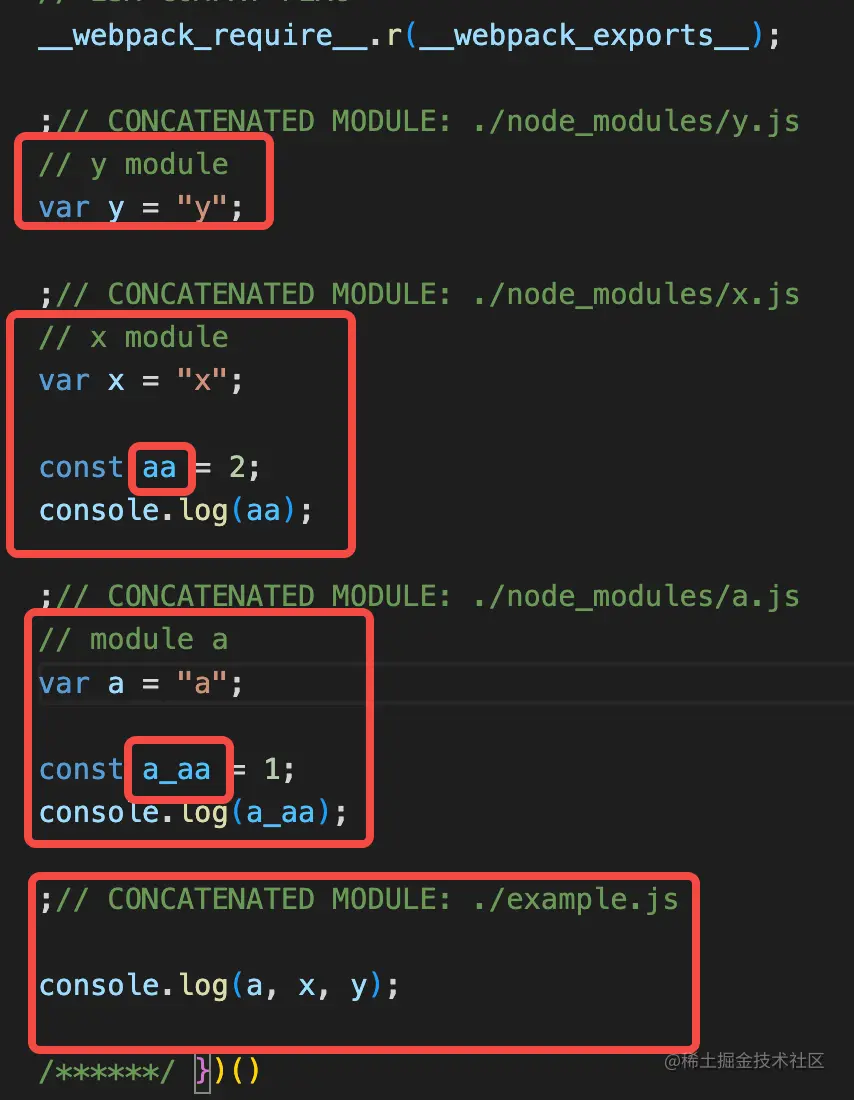 a、x、y 模块的代码被合并到了一个函数作用域里。