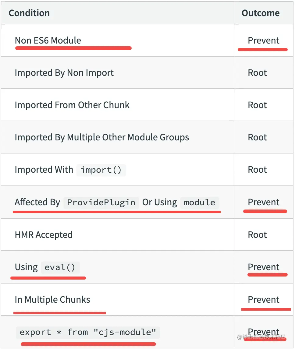当然,也不是所有的模块都可以 scope hositing,有一些模块不可以,主要是被多个 chunk 包含的模块、有 cjs 代码的模块、有 eval 的模块、用到了 module 变量的模块。