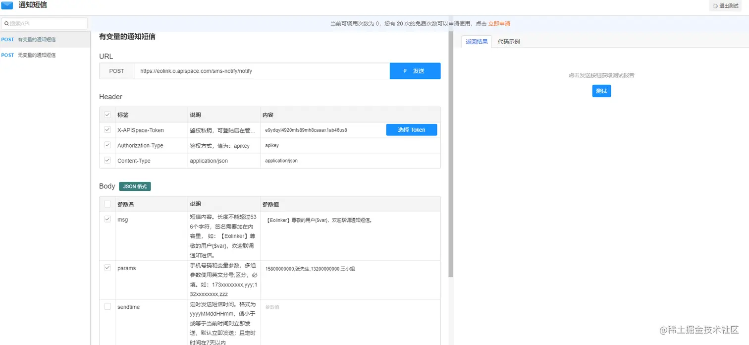 在APISpace 网站上,我们可以在通知短信 API 详情页上,获取它的示例代码。