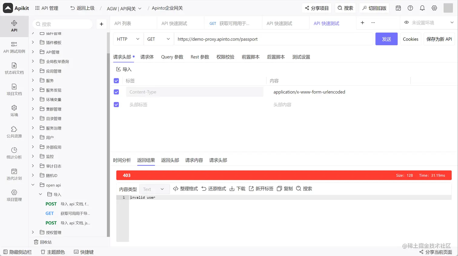 下线匿名应用并且禁用掉,那么不带test这个应用的鉴权,调用testAPI这个API是调不通的报403,看结果: