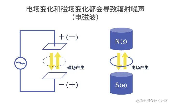 辐射噪声比传导噪声还要令人难以捉摸。即使没有线缆连接,辐射噪声也会找机会侵入其它电子设备,系统内的噪声会变为系统间的噪声,扩大影响范围。在高频电流的电路中,线路的电感等成分会产生无用的电磁波,这也属于噪声。由于电磁波的辐射量与频率的平方成正比,所以时钟频率高达Ghz的电脑等设备等成为了辐射噪声的主要产生源之一。