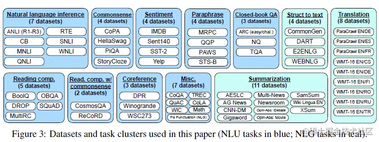在构建数据集上,谷歌比较传统。直接把Tensorflow Dataset上12个大类,总共62个NLP任务的数据集,通过模板转换成了指令数据集