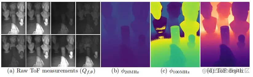 ToF系统使用20MHz和100MHz方波调制其红外光源,并在两个频率之间交替。传感器每个频率通过Four-Sampling-Bucket算法,获得4个相位延迟为0°,90°,180°和270°的采样信号。使用两个频率,我们每次快照可以获得八个原始ToF测量值(上图a):