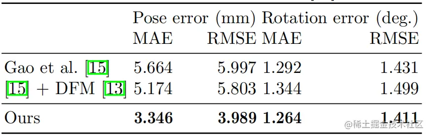 为上文的ToF置信度。除了这种监督之外,我们还使用6D三维旋转表示方法代替旋转矩阵,欧拉角,四元数等常见三维旋转表示,实现了外参和内参的细化。我们的训练和验证数据集有8个场景,每个场景大约有100个快照。这些场景具有不同的深度范围、背景、物体和材料。