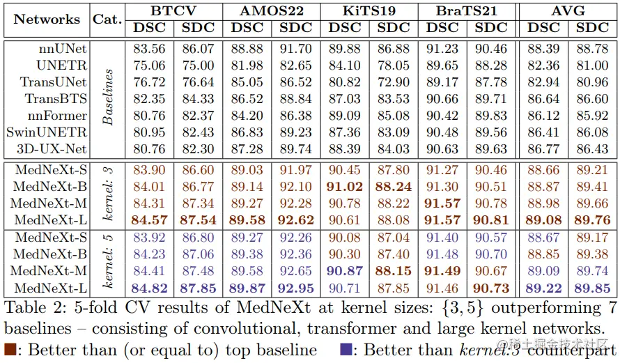 从上表可以看出,MedNeXt针对现有的四个主流的医学图像分割数据集均取得了SOTA的性能,而无需额外的训练数据。尽管存在任务异质性(脑和肾肿瘤、器官)、模态(CT、MRI)和训练集大小(BTCV:18 个样本 vs BraTS21:1000 个样本),但 MedNeXt-L 始终优于当前最先进的算法,如nnUNet。此外,借助 UpKern 和 5 × 5 × 5 的卷积核,MedNeXt 利用完全复合缩放进一步改进其自身网络,在器官分割(BTCV、AMOS)和肿瘤分割(KiTS19、BraTS21)方面进行全面改进。