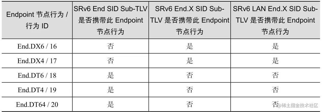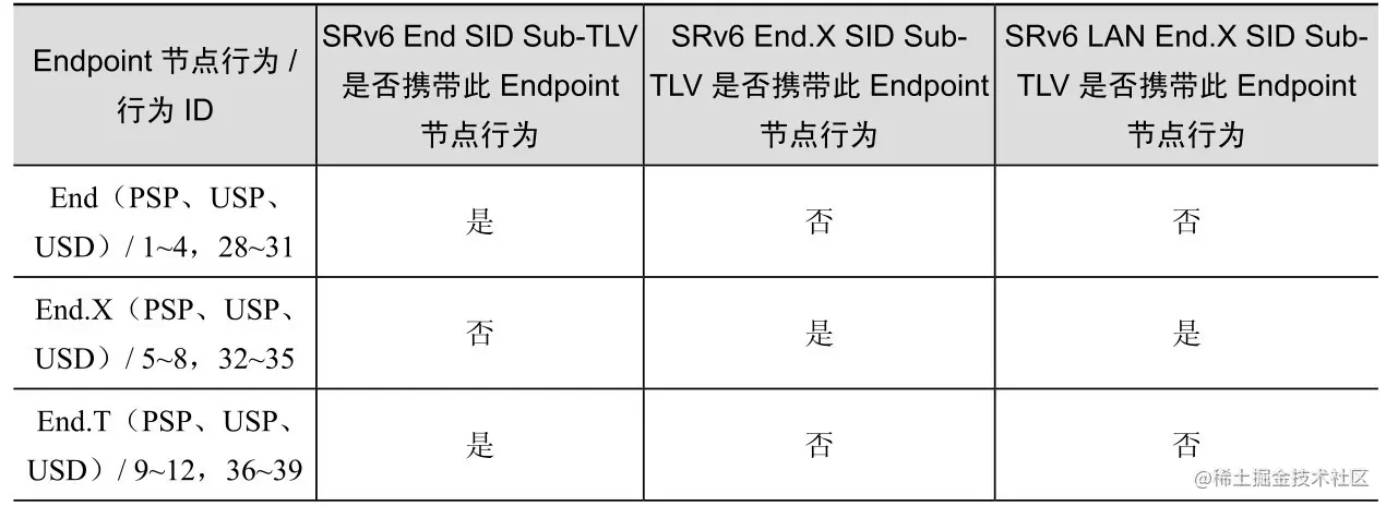 IS-IS协议的另一个功能就是将SRv6 SID信息和SID对应的SRv6 Endpoint节点行为信息通过IS-IS协议的各类SID Sub-TLV扩散出去,用于路径/业务编程单元对网络进行编程,IS-IS协议发布的Endpoint节点行为如表3-1所示。