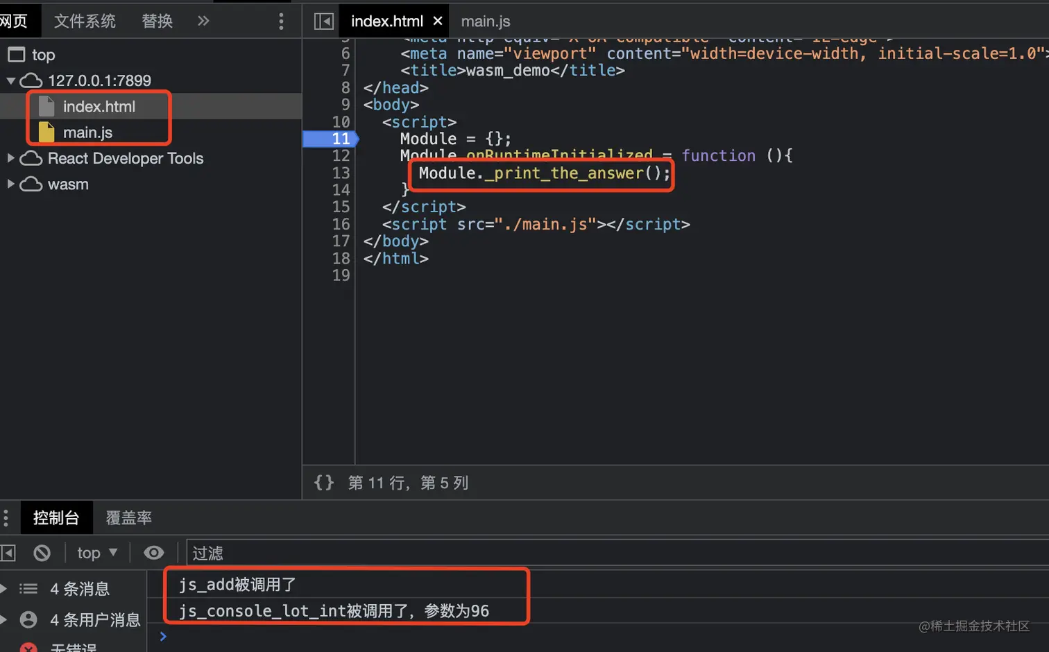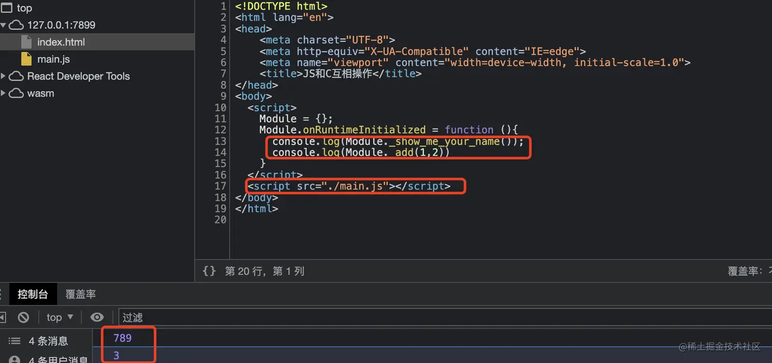 我们可以在index.html中引入刚才C导出的两个函数show_me_your_name/add