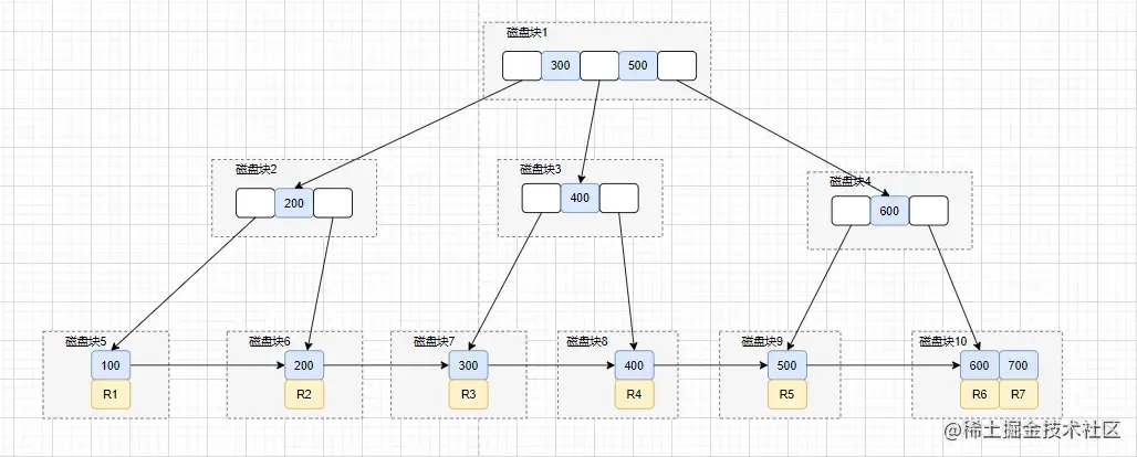 id主键索引树,将磁盘块1加载到内存,因为300<400<500,所以在选择中间分支,到磁盘寻址磁盘块3。 - 虽然在