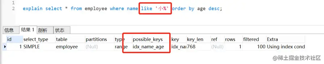 这个SQL: select * from employee where name like '小%' order by age desc; 也是命中索引的。