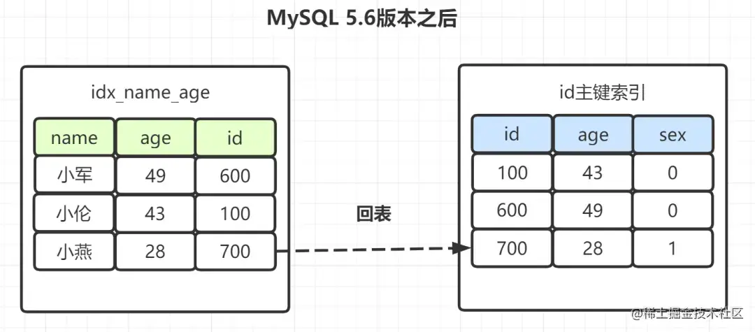 如果是Mysql5.6之前,在idx_name_age索引树,找出所有名字第一个字是“小”的人,拿到它们的主键id,然后回表找出数据行,再去对比年龄和性别等其他字段。如图: