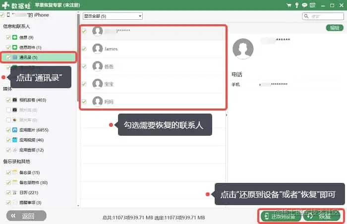 第3步:扫描结束,在界面左侧的【通讯录】进行点击。在展现出来的联系人进行勾选,点击【还原到设备】,或者是**【恢复】**,根据你的需要来选择即可。