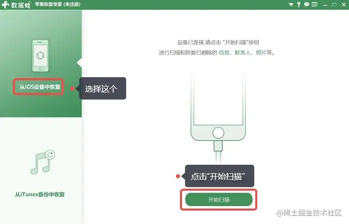第2步:通过数据线把手机与电脑连接,然后选择【从iOS设备中恢复】,点击**【开始扫描】**;