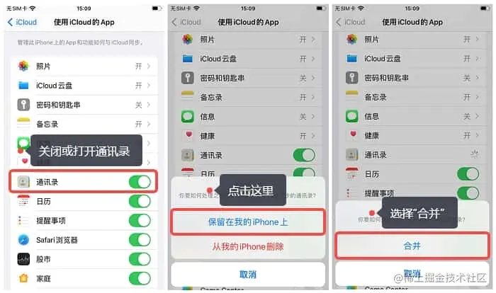 第3步:如果你的【通讯录】是关闭的,那就打开它,再点击【合并】。