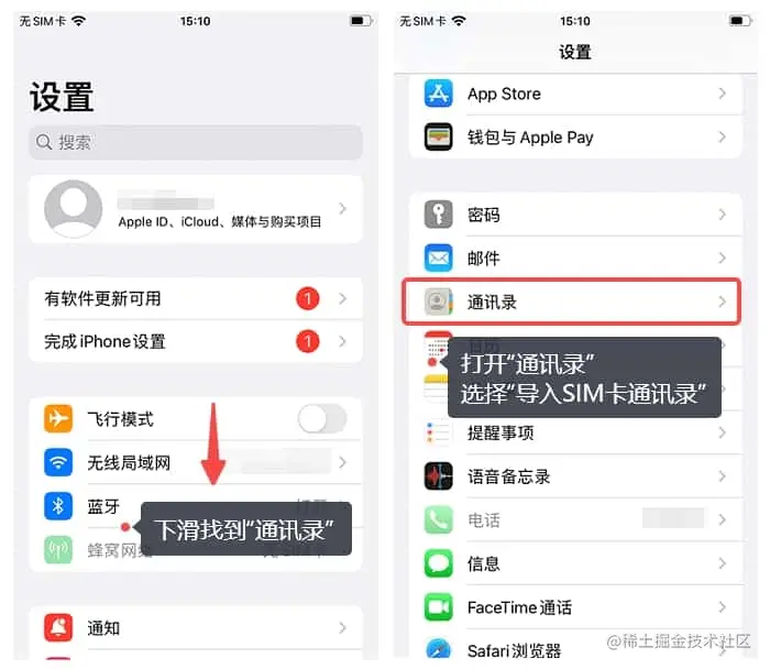 第2步:在【设置】应用程序中,进入【通讯录】选项,并选择【导入SIM卡联系人】;