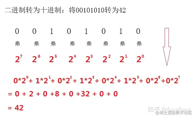 (0 * 2的零次方) + (1* 2的一次方)+ (0 * 2 的二次方)+(1 * 2的三次方) +(0 * 2的四次方) +(1* 2的五次方) + (0 * 2的六次方) + (0 * 2的7次方) = 0 + 2 + 0 + 8 + 0 + 32 + 0 + 0 = 42