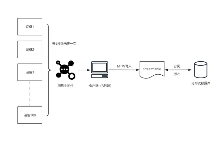 如某厂区有100台设备,每台设备通过独立的传输链路将数据一条条发送到 API 端,再统一通过 API 端写入到 DolphinDB。