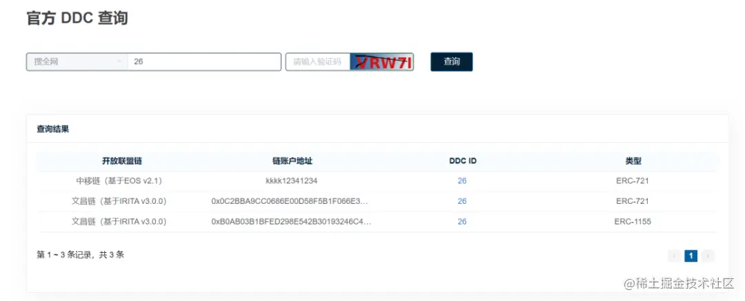进入查询页面后,可选择需要查询的开放联盟链(默认查询全部链),输入DDC的ID或者链账户地址,再输入验证码完成验证后即可进行查询。