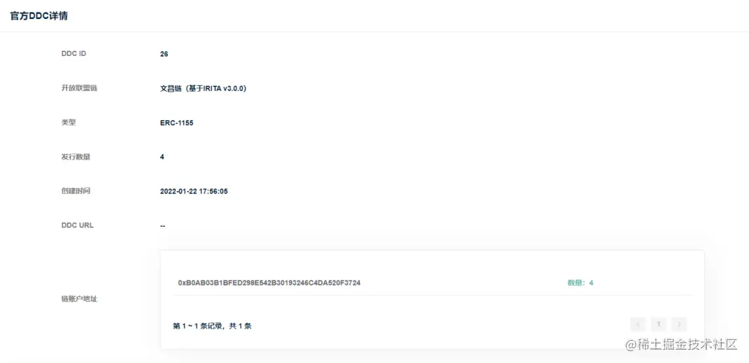 【官方DDC详情】包括DDC ID、所属开放联盟链、类型、发行数量、创建时间、DDC URL、所属链账户地址及数量列表等信息;