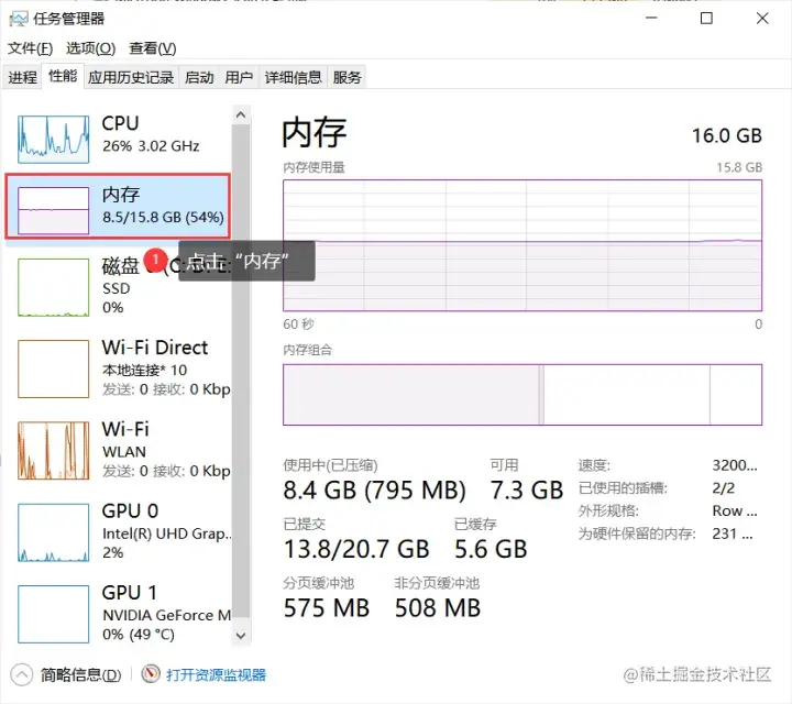 在“性能”选项卡中,您可以看到电脑内存使用情况的详细信息。在 “内存”部分,您可以看到已使用内存的数量和可用内存的数量。其中,可用内存指的是操作系统可供应用程序使用的内存量