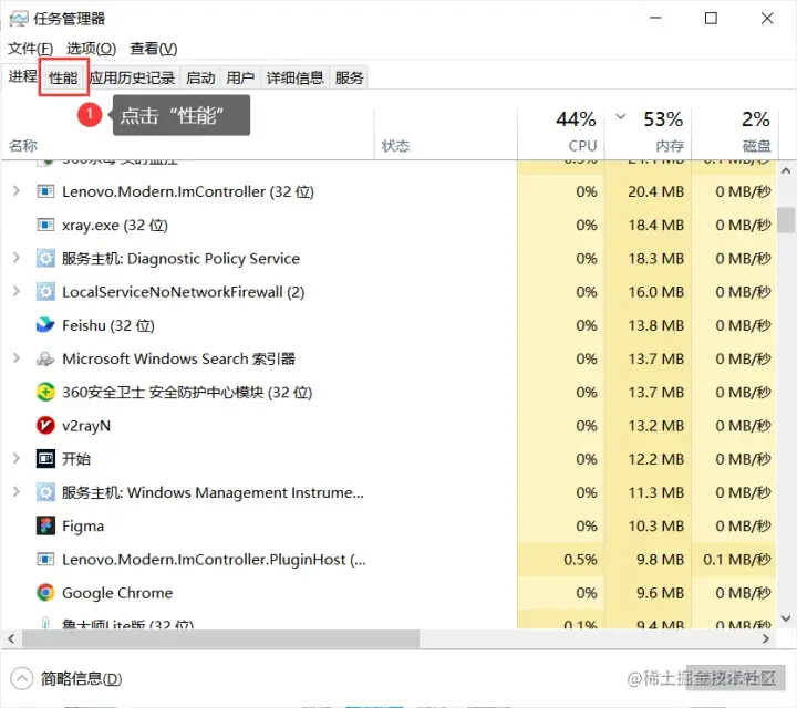 在任务管理器窗口中,切换到 “性能”选项卡。这个选项卡会显示电脑的资源使用情况,包括CPU、内存、磁盘和网络。