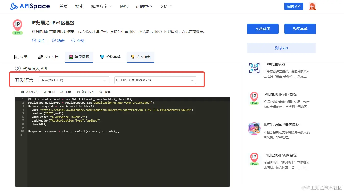 在APISpace 网站上,我们可以在 IP 归属地 详情页上,获取它的示例代码。