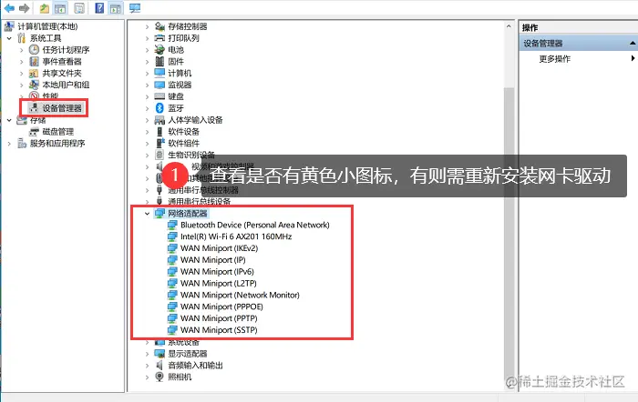 - 在 【设备管理器】 中查看是否有黄色图标,若有黄色图标,则需要重新安装网卡驱动。