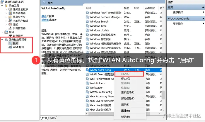 3.若无黄色图标,展开 【服务和应用程序】 ,单击【服务】,找到【WLAN AutoConfig】 ,单击右键选择 【启动】 。