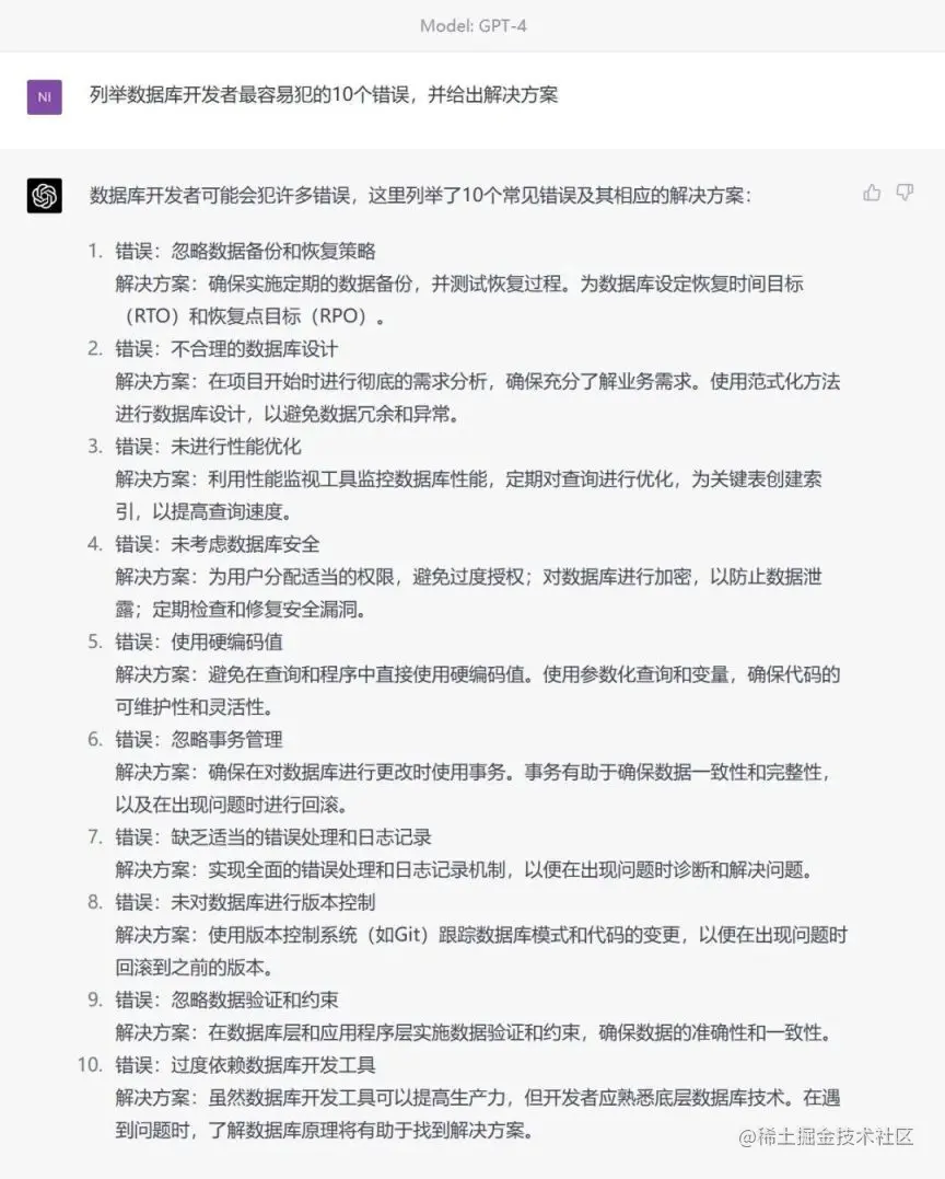 我让 ChatGPT4 列举出【数据库开发者最容易犯的 10 个错误和解决方案】