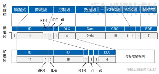 数据帧根据仲裁段长度不同分为标准帧(2.0A)和扩展帧(2.0B)