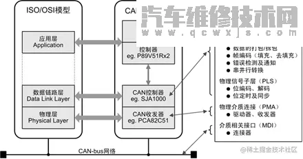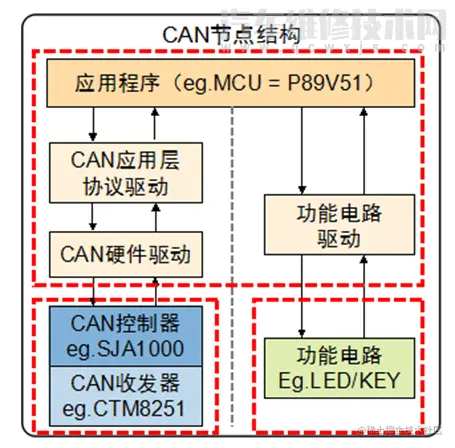 CAN收发器和控制器分别对应CAN的物理层和数据链路层,完成CAN报文的收发;功能电路,完成特定的功能,如信号采集或控制外设等;主控制器与应用软件按照CAN报文格式解析报文,完成相应控制。