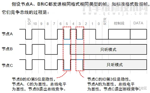 CAN总线控制器在发送数据的同时监控总线电平,如果电平不同,则停止发送并做其他处理。如果该位位于仲裁段,则退出总线竞争;如果位于其他段,则产生错误事件。
