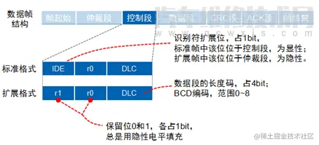 共6位,标准帧的控制段由扩展帧标志位IDE、保留位r0和数据长度代码DLC组成;扩展帧控制段则由IDE、r1、r0和DLC组成。
