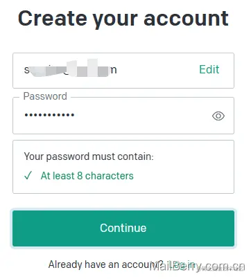 输入密码,要求大小写,最少8位,见到有对勾At least 8 characters再点Continue