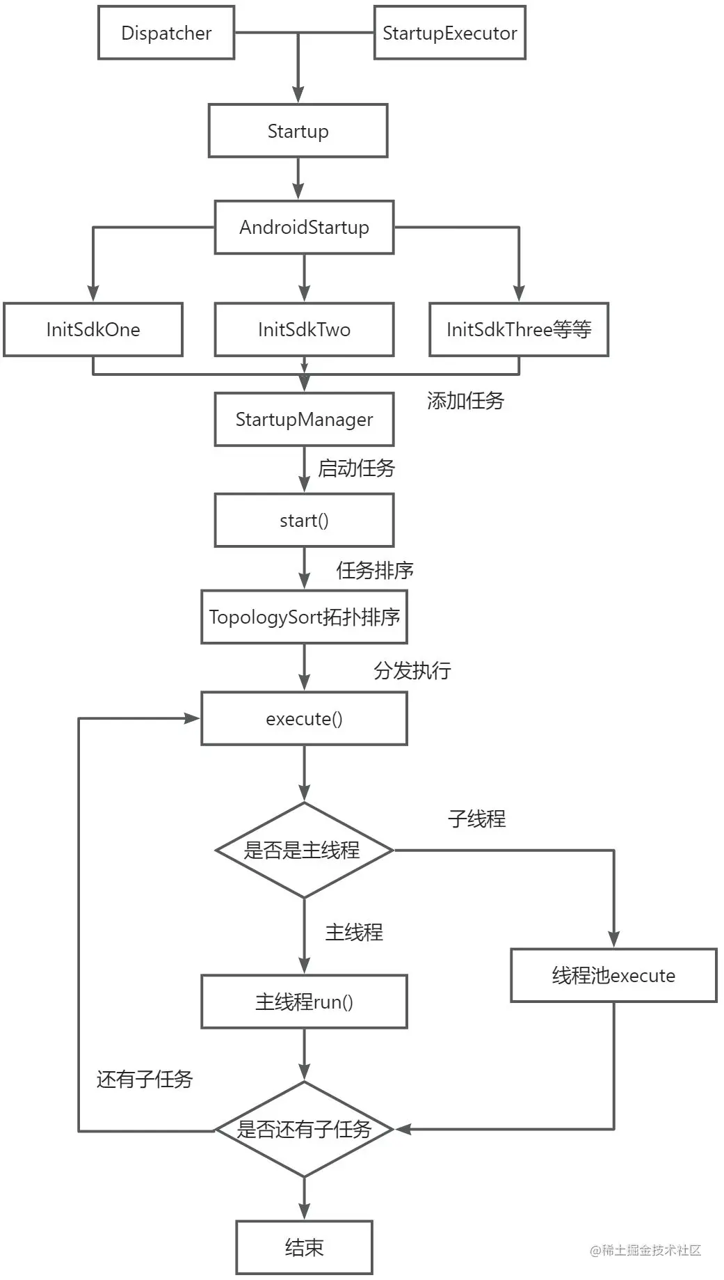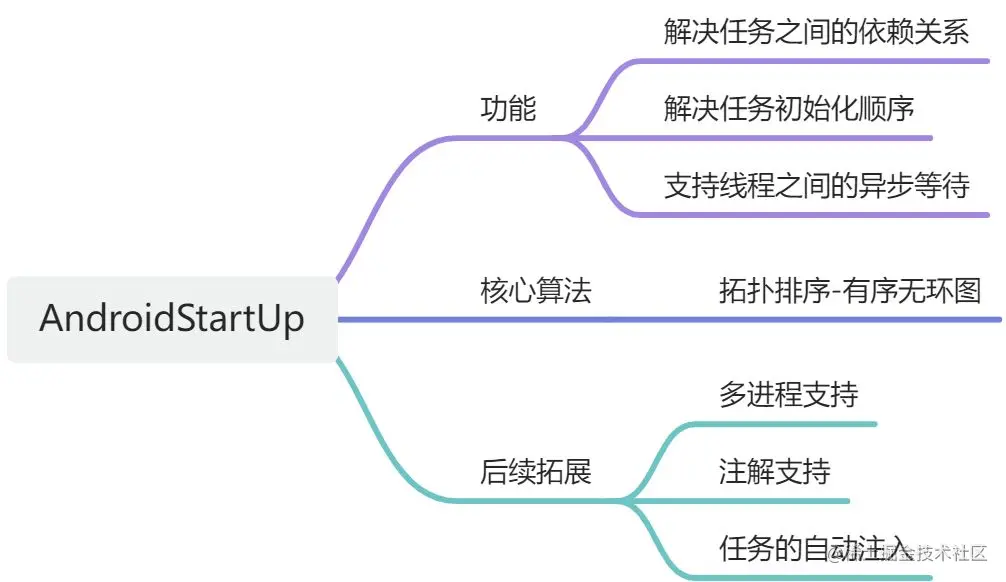 AndroidStartup 使用拓扑排序解决了任务之间的依赖关系,同时支持子线程和主线程切换。子线程可以等待主线程任务执行结束之后在执行,保证了任务之间的有序性,目前只是实现了简单的任务的手动添加。后续通过注解,字节码插桩等其他方式完成任务的自动注入。“ 本文正在参加「金石计划」 ”