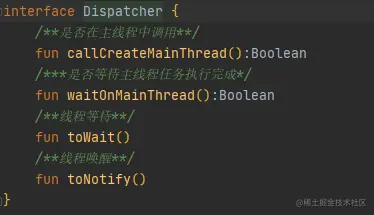 Dispatcher分发接口中主要定义四个方法,callCreateMainThread(),waitOnMainThread(), toWait(),toNotify()。