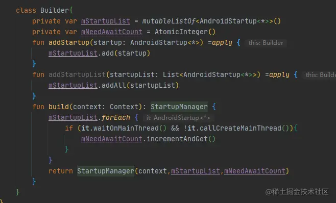 StartupManager内部使用内部类Builder用来构建StartupManager所需要的任务信息,同时使用AtomicInteger原子类记录需要等待的任务数。