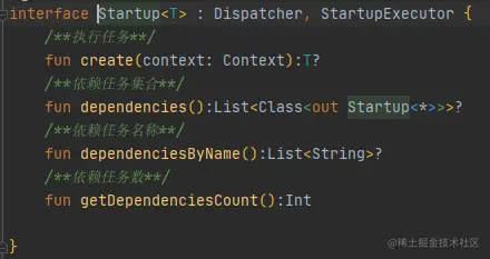 定义Startup接口继承于Dispatcher和StartupExecutor,其中StartupExecutor用来提供线程池。同时在Startup中定义了四个方法,分别是create(),dependencies(),depedenciesByName(),getDependnciesCount()。
