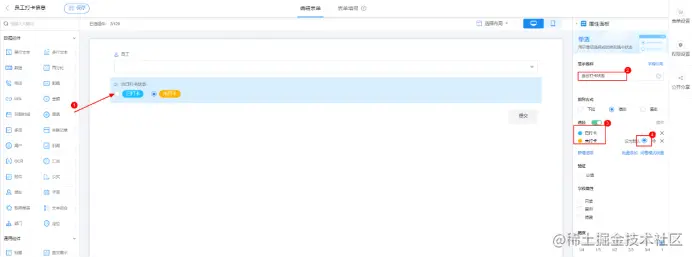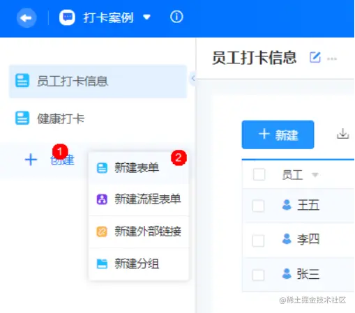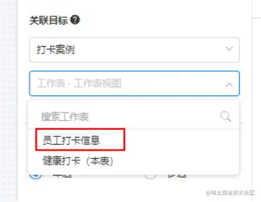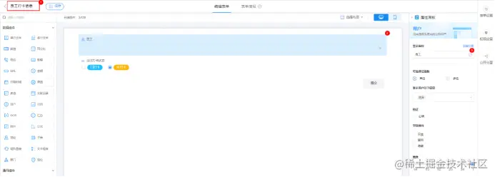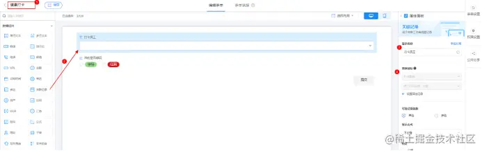5、设置表单名称为“健康打卡”,拖拽“关联记录”组件到画布上,设置显示名称为“打卡员工”。