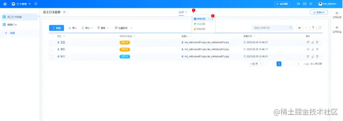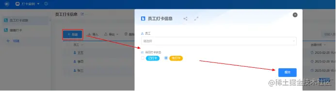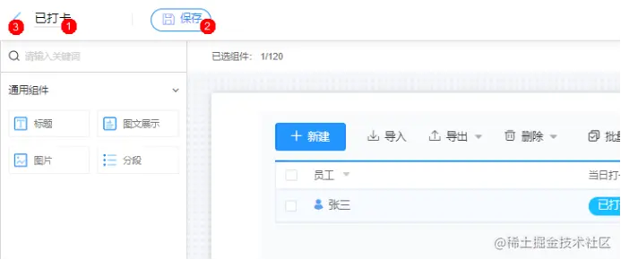 3、在新建的表单中,为表单命名“员工打卡信息”,拖拽“用户”组件到右侧画布,将组件名称改为“员工”。