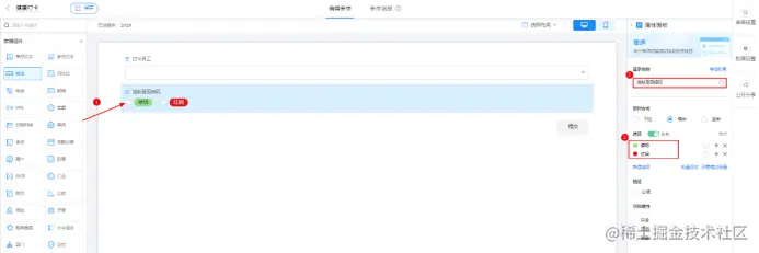 拖拽“单选”组件到画布上。在右侧的属性中,修改名称为“每日打卡状态”,设置两个选项的名称分别为“已打卡”、“未打卡”,“点击”下图位置4(将状态默认值设置为未打卡,右侧圈圈)。