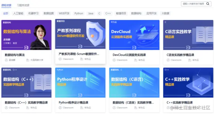 华为云Classroom实时捕捉热点与前沿技术,联合华为互联网技术专家,以真实案例打磨课程。课程资源丰富全面,包括350+的免费编程资源、50+在线精品课程资源、60+沙箱实验课程资源;还开创了全类型工程实训课程,10+种企业类实践课程。