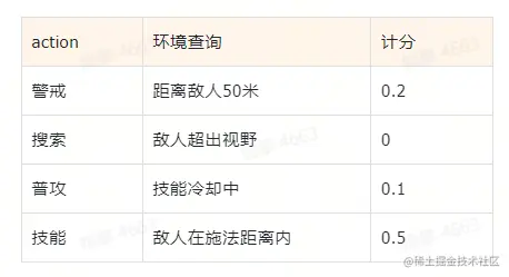 例如,一个游戏中的 NPC AI 在不同的饥饿程度时,决定是否去吃饭的情况。如果环境系统探测到 NPC 极度饥饿,那去吃饭的 action 的 score 就可能是 1;相反,如果 NPC 判断自己很饱,去吃饭的 action 的 score 值就是 0。